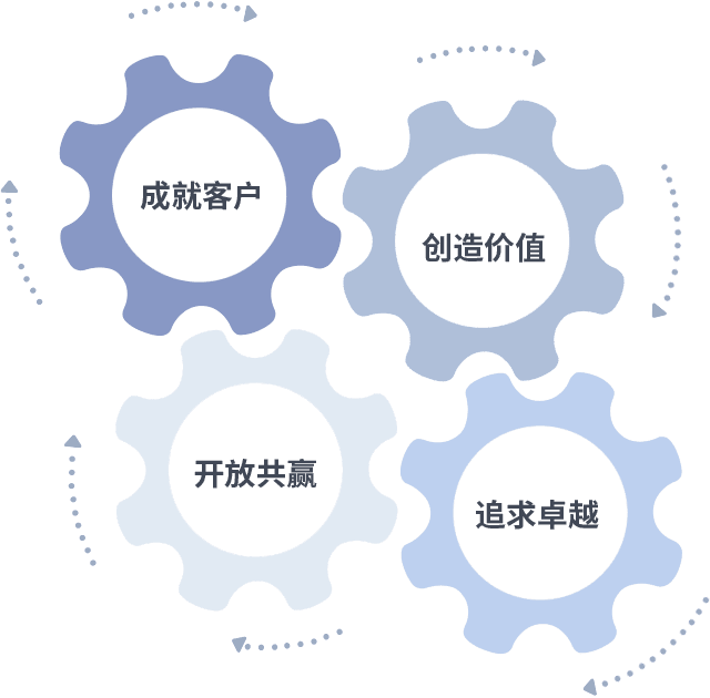 成就客户是一切决策的出发点,,,,创造价值是衡量所有工作的标准,,,追求卓越是我们做事做人的态度,,开放共赢是我们的格局也是最终的结果。。价值观的齿轮环环相扣,,,推动着组织里的每个人不断向前。。。